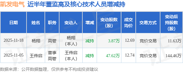 证券之星消息✿★★,根据11月19日市场公开信息✿★★、上市公司公告及交易所披露数据整理体育帝国下载✿★★,凯发电气(300407)最新董监高及相关人员股份变动情况✿★★:2025年11月18日公司高管杨翔共减持公司股份3.87万股✿★★,占公司总股本为0.0122%凯发k8一触即发✿★★。变动期间公司股价下跌1.32%✿★★,11月18日当日收盘报12.73元✿★★。